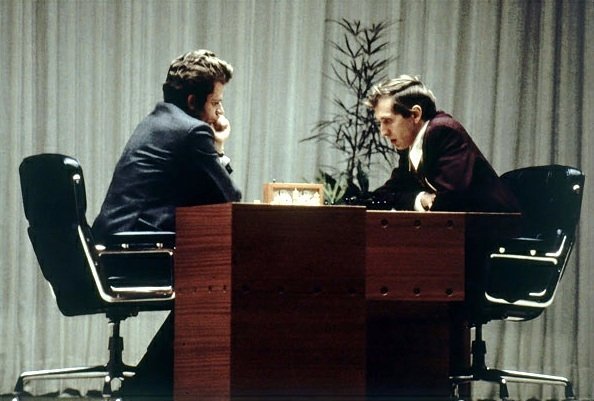 A foto que ilustra esse post – reproduzida no The New York Times, no obituário Bobby Fischer, em 19 de janeiro de 2008 – mostra os dois mestres, concentrados no jogo e sentados sobre as duas relíquias.