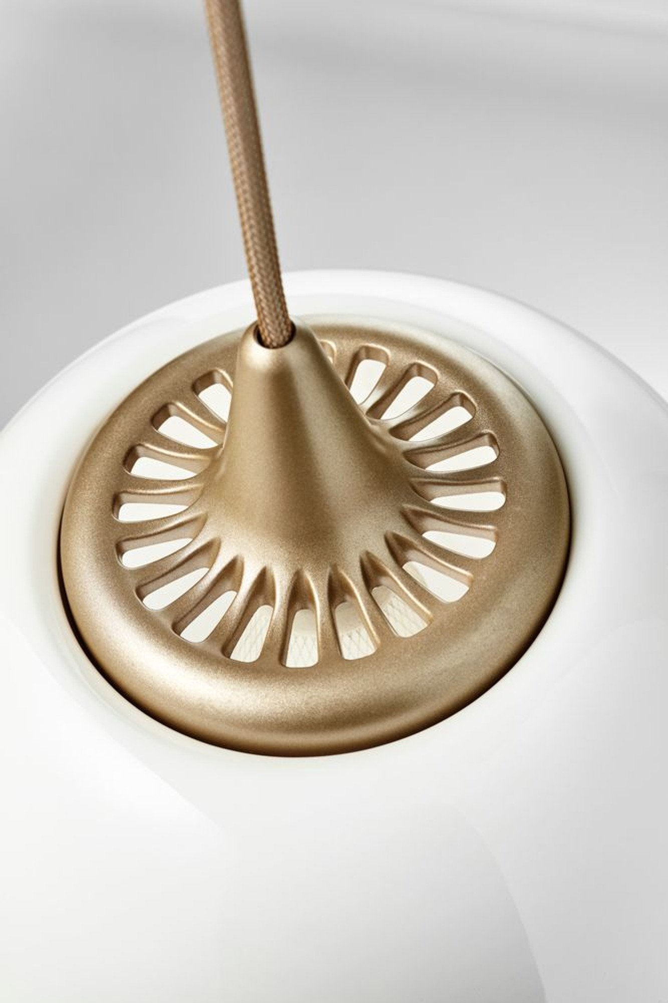 Translúcida com sua cúpula em porcelana de osso com argila branca, a Dogu emite uma luz acolhedora.